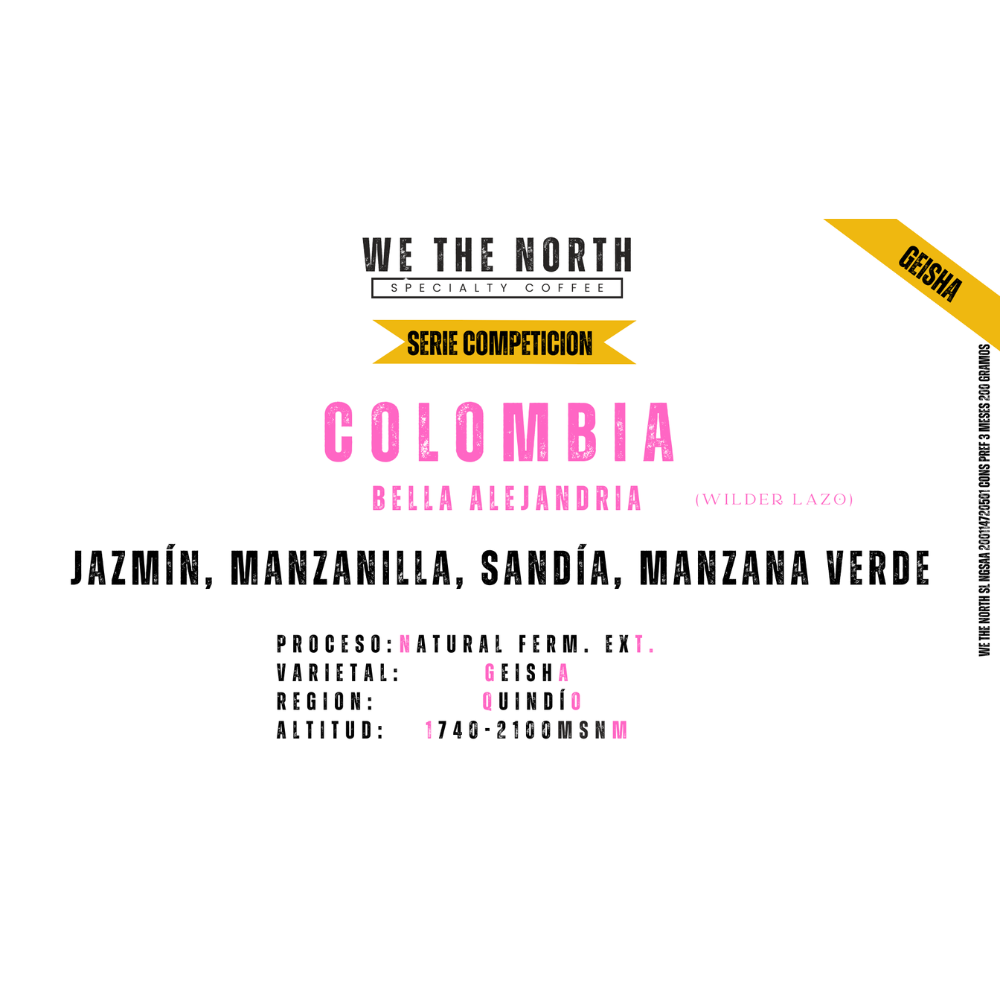 SERIE COMPETICIONWE THE NORTHCAFÉSCOLOMBIADesde la región del Quindío en Colombia, un Geisha natural con fermentación extendida, cultivado entre 1740 y 2100 msnm, que ofrece un perfil floral con notas de jazmín, manzanilla, sandía y manzana verde.