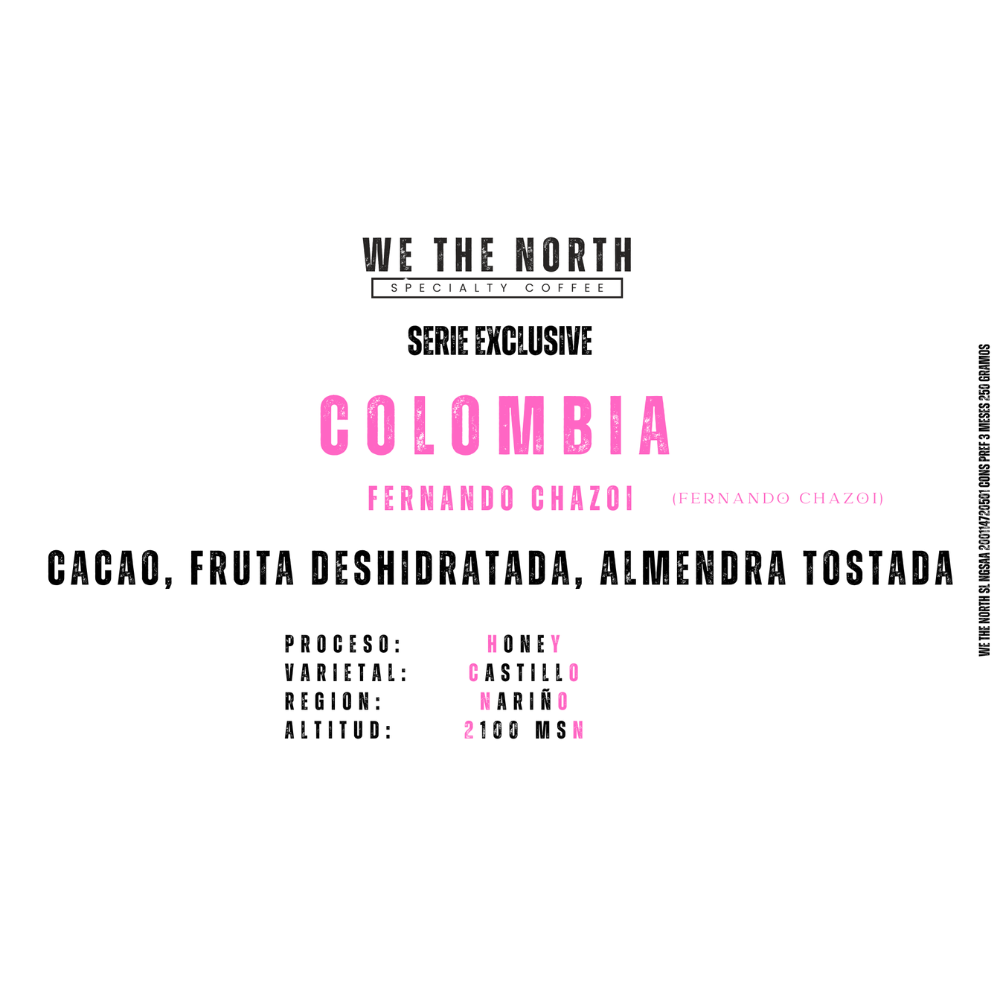 SERIE EXCLUSIVEWE THE NORTHCAFÉSCOLOMBIAUn café excepcional de Nariño, cultivado a 2100 metros de altitud por Fernando Chazoi. De proceso honey, revela un perfil sofisticado con notas de cacao, fruta deshidratada y almendra tostada.